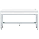 We love this modern five-piece counter height dining set in place of a console behind a floating sofa, offering exceptional versatility and refined style in any setting. It boasts two nesting tables, each long and narrow like a sofa table, but paired with three backless stools that tuck underneath. It's the perfect spot for drinks with friends on game day, or setting yourself up to work from home on a snowy day. The silver and white set features a larger table with wheels on the smaller table to create any configuration that works for you. Stools are decorated with artistic bases with open, floating frames that add Deco flair and white faux leather upholstery over padded seats for optimal comfort.