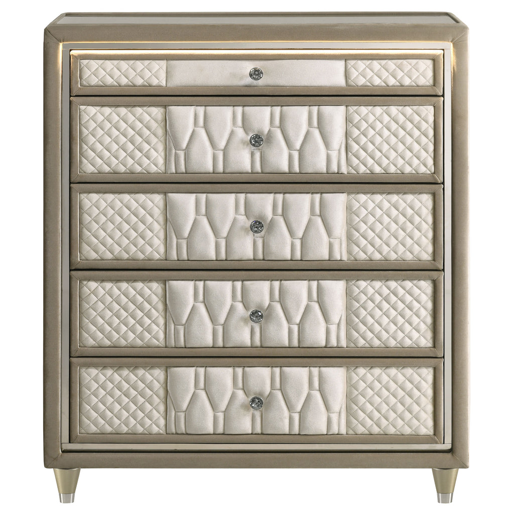 Embrace elegance in full velvet with this five-drawer chest, where ambient lighting meets refined craftsmanship. Upholstered in a harmonious mix of ivory and camel velvet, each drawer is adorned with quilted textures, reflective acrylic accents, and crystal knobs for a soft yet glamorous presence. Integrated LED lighting casts a warm glow, while the brown felt-lined top drawer, English dovetails, tempered glass top, and heavy-duty glides elevate everyday function. Supported by solid rubberwood legs, this chest blends softness with luminous charm. Key Features: • Five-drawer chest fully wrapped in camel and ivory velvet for a layered plush effect • Built-in LED lighting highlights reflective acrylic details for soft visual glow • Top drawer lined in brown felt to protect jewelry, watches, or fine accessories • Tempered glass top, crystal knobs, and quilted textures elevate the glam aesthetic • English dovetail joinery and heavy-duty glides offer smooth, lasting durability • Solid rubberwood legs provide sleek support with a touch of modern radiance