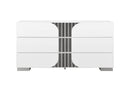 The Talia Dresser offers ample storage with its textured drawer fronts, making it both practical and stylish. Finished in a sleek white with chrome accents, it complements any modern bedroom decor.