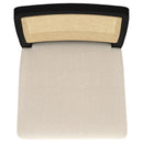 This dining chair combines modern comfort with organic charm, featuring a handwoven cane backrest crafted in Indonesia for a natural, textured appeal. The solid Asian hardwood frame provides durability and a warm aesthetic, while a beige linen-like upholstered cushion enhances its cozy style. Pirelli webbed seat construction ensures both comfort and lasting support. Reinforced with a sleek metal stretcher bar, this chair balances beauty and functionality.
