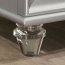 Create a room made for a princess with this bedroom set from the Maddie Collection. The curved headboard is padded and upholstered in a horizontally-tufted fabric, emphasizing the pearl white finish. The dresser and chest feature acrylic legs, crystal accents, and a beveled mirror with a LED light creating a glamorous aesthetic. Give into your glitzy side with this opulent set.