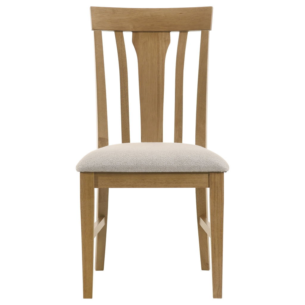 A fresh take on familiar tradition, this dining side chair pairs soft contours with classic craftsmanship. The sculpted slat back design adds character and support, while the padded light tan seat cushion provides lasting comfort. Framed in solid rubberwood with engineered wood accents and a light brown finish, this chair offers a relaxed yet polished look that fits effortlessly into casual or transitional dining spaces. Key Features: • Dining side chair features a sculpted slat back with a gently curved top rail • Light tan padded seat cushion provides lasting support and subtle contrast • Crafted from solid rubberwood, engineered wood, and foam for durability and comfort • Natural light brown finish highlights wood grain and adds warmth to the frame • Tapered legs and supportive stretchers offer strength and visual balance • Blends well with traditional, rustic, and casual transitional dining table styles