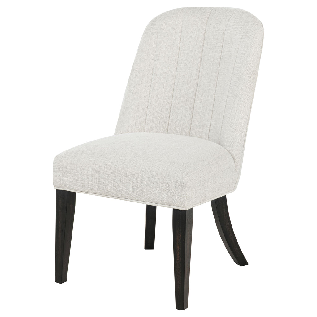 Graceful by design and soothing in tone, this upholstered dining chair invites lingering with every curve. Draped in creamy fabric, its gently channeled backrest rises in soft vertical lines, embracing you in subtle elegance. Burnished black legs flare with sculptural ease, grounding the silhouette in warm contrast. From candlelit dinners to quiet morning coffees, this chair offers a seat not just at the table, but at the heart of the home. Key Features: • Dining side chair wrapped in cream fabric with subtle channel tufting along the back • High back design offers supportive comfort for long meals and conversation • Burnished black flared legs contrast beautifully against the light upholstery • Foam-padded seat and backrest provide soft, resilient cushioning • Crafted from rubberwood, engineered wood, and performance fabric • Perfectly pairs with round or rectangular tables for modern, timeless appeal