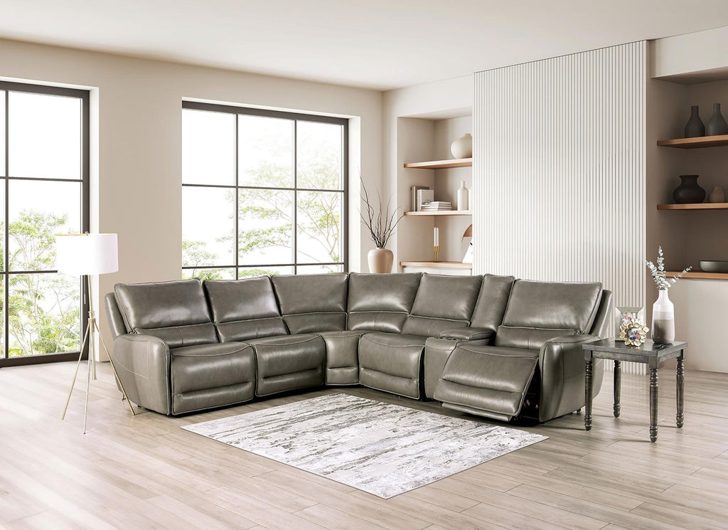 Suitable for any modern home, this gray sectional will liven up any living room it graces. It starts with the materials upholstered in top grain leather, the frame within is made of kiln-dried hardwood, corner blocked for maximum durability. High density foam and a no sag suspension go underneath each seat, with heavy duty reclining mechanisms controlled by a simple touch of a button. The L-shaped sectional offers plenty of seats with zero gravity position and extendable footrests for everyone to stretch out and relax. Designed to stay off the wall even with just three-inch space, its the kind of furniture that takes into account the intricacies of living in a more modest space.