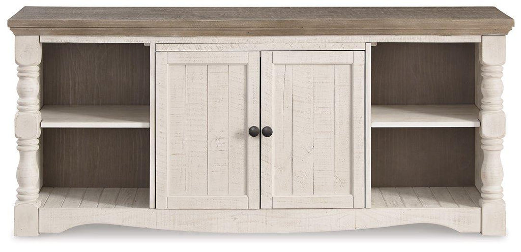 Set your sights on modern farmhouse style with this XL TV stand. Distressed two-tone treatment blends a weathered gray with vintage white for an utterly charming effect. Turned posts lend a hearty, substantial look that feels right at home, while plenty of open shelving makes the aesthetic anything but heavy.