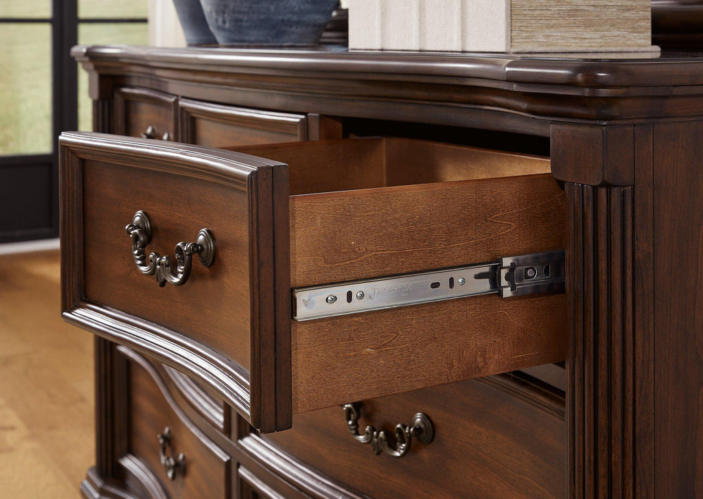 Take inspiration from the traditional luxury of this dresser with mirror. Classic with a rich cherry brown finish, its stately presence graces your room with an air of opulence. Your taste for exquisite details is satisfied with decorative drawer pulls and the mirror's ornate accent filigree. With seven drawers acting as elegant hosts for clothes and other essentials, your restful retreat has never been so refined.
