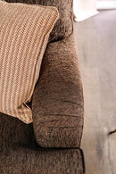 Nothing says home like a nice earth-tone piece. The warmth that this sectional brings may be attributed to its daring color theme: the base chenille fabric is in dark brown accentuated with pops of orange and rustic hues found in the throw pillows. But the inviting feeling is more than skin-deep; it also features classic elements of the English sofa pleated, curved low arms and traditional T-cushions which are known for the welcoming comfort they provide.