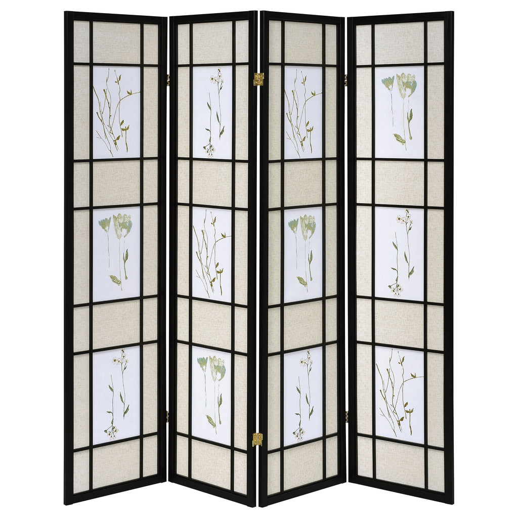 The world may be getting smaller, but some things still warrant privacy. Put on makeup or fill up a diary in secret behind this four-panel screen. Framed in black, panels can be pulled close or extended to customize your secrecy. Panel screens come in a floral print that's feminine and artsy. Use it to divide a room or put in front of a window to keep things intimate. Key Features: • Four panel screen with printed floral detail • Wood frame in black finish • Floral fabric panels framed in stained glass style • FSC certified wood frame • Rubberwood construction