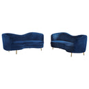 Art Deco never looked so dramatic! This retro-inspired seating set features a vivid deep blue velvet upholstery throughout, complementing by mid century modern style tapered legs in a warm gold hue. Extra details such as channel tufted interior and a vintage kidney-shaped silhouette truly make this seating ensemble one of a kind. A twist on the iconic tuxedo style, this seating group has sleek, slim track arms and an inverted camelback backrest that flows into one another. Boasting a regal aesthetic, each furniture piece offers to be a centerpiece.