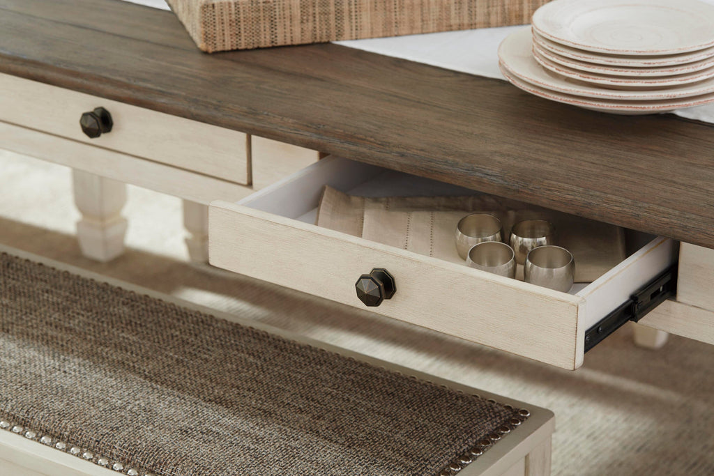 The beauty of this dining table is something to savor. A two-tone textural finish gives this rectangular dining table with plank-effect top a double helping of charm. Six drawers built into the table apron allow you to keep placemats, napkins and utensils right on hand.
