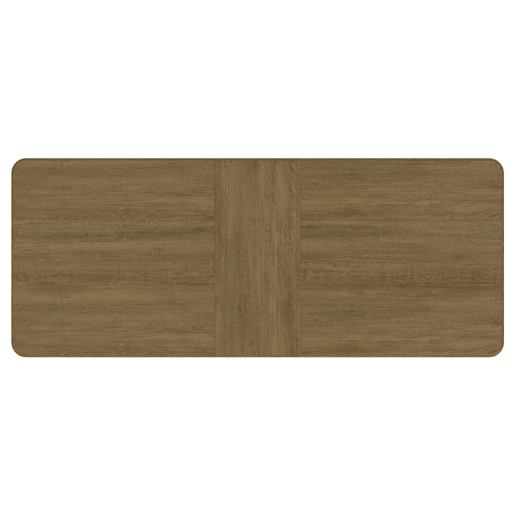 This dining set blends modern craftsmanship with natural textures for a refined yet inviting feel. The dining table features a trestle base with an antique brass-finished metal stretcher bar, adding stability and contrast. Rounded corners soften the rectangular top, while a removable 18-inch leaf allows for flexible seating. The dining chairs feature handwoven cane backrests, solid wood frames, and Pirelli webbed seat cushions upholstered in beige linen-like fabric for lasting comfort and support. A wood grain finish enhances the natural beauty of the materials.